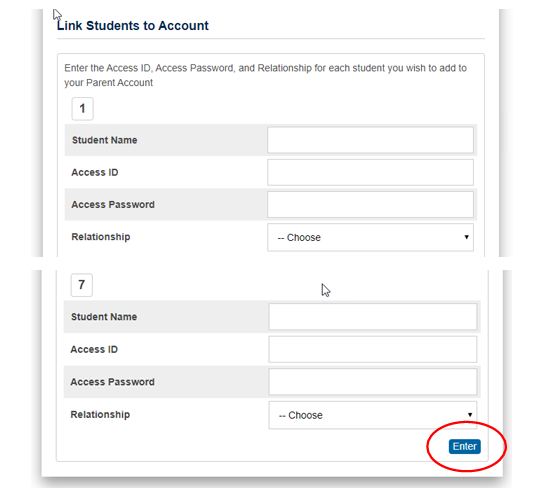 Now Scroll down to the “Link Students to Account” section and enter the students Name, Confidential ID # and password that the school supplied in the letter. You can add up to 7 students, when you’re done click the Enter button at the bottom of the page.